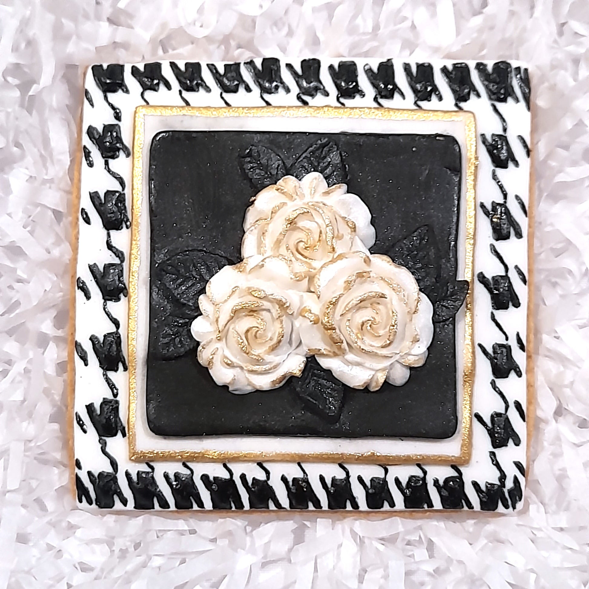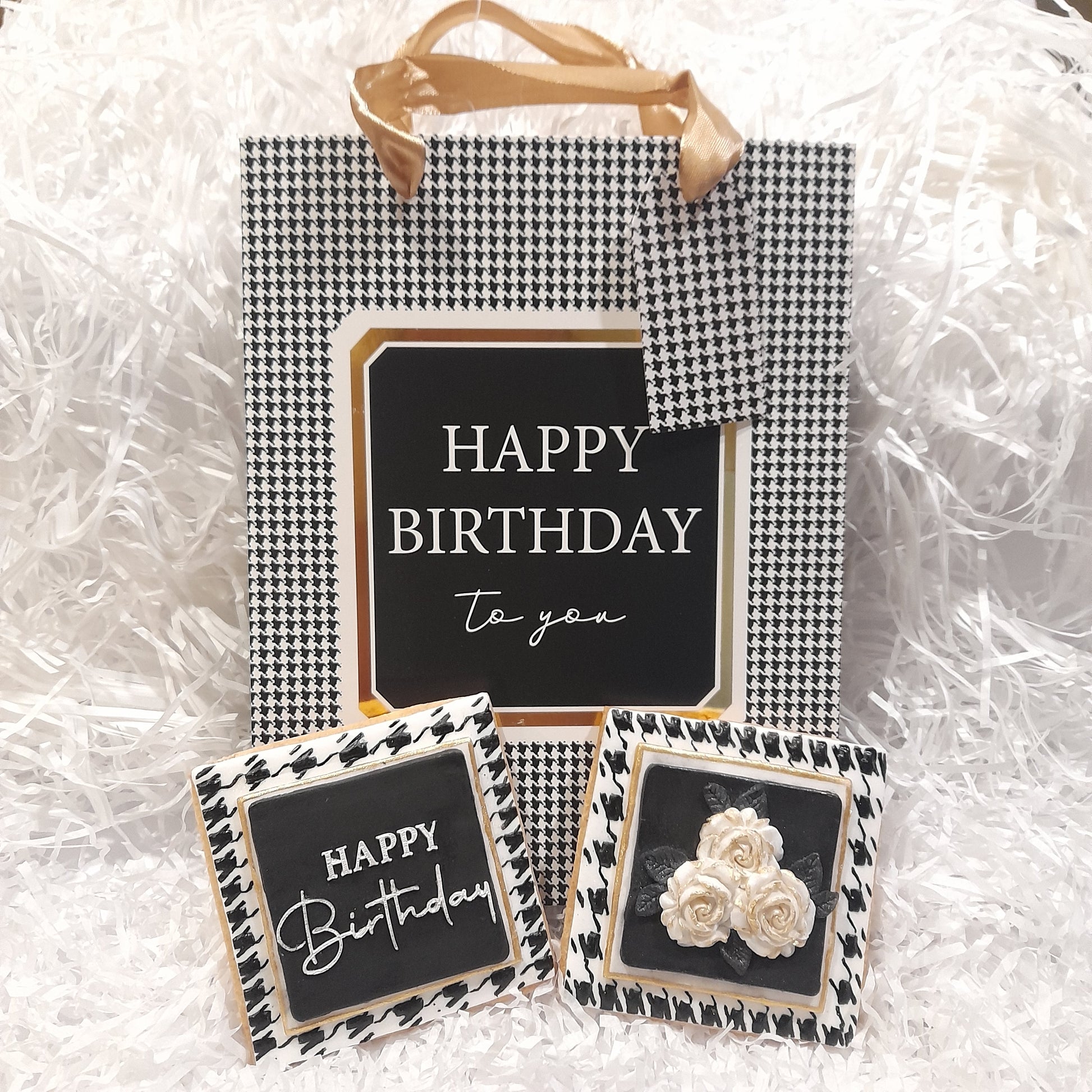 These smart handpainted houndstooth cookies were made to match the gift bag pictured but just as beautiful without the matching bag (unless you have something else 'houndstooth' to match them too)