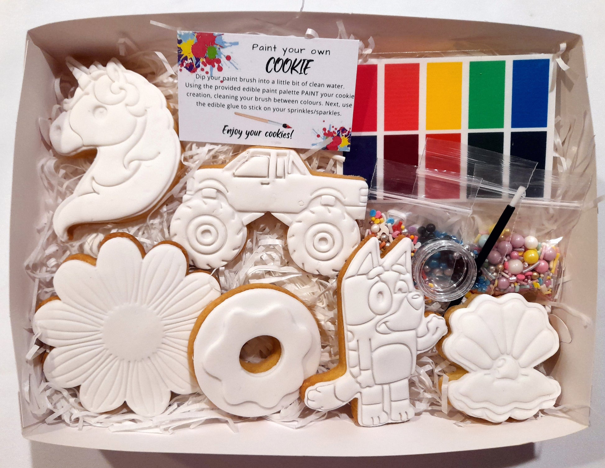 Cookie kits comes with a edible paint pallet, sprinkles, paint brush and a pot of edible glue.